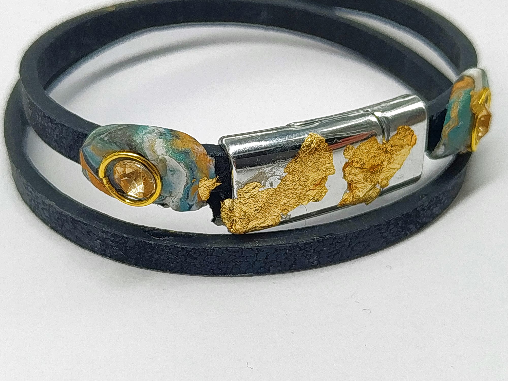 Un completo uomo bracciale e collana con ciondolo, creati a mano con sfumature di color verde e bianco.Arricchito con strass e decorazioni geometriche e foglia d'oro. Il bracciale in cuoio nero con chiusura magnetica, con applicazioni di argilla polimerica e strass. Un completo innovativo, elegante e ricercato.